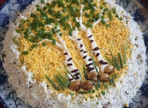 Сверху салат с куриным филе и грибами Березовая Роща украсить полосками