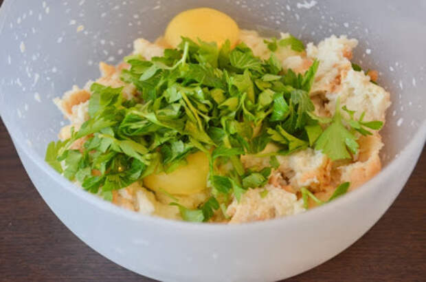 В хлеб добавляем зелень, яйца и чеснок, пропущенный через пресс. Как следует размешиваем.
