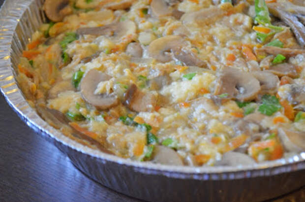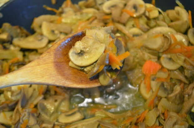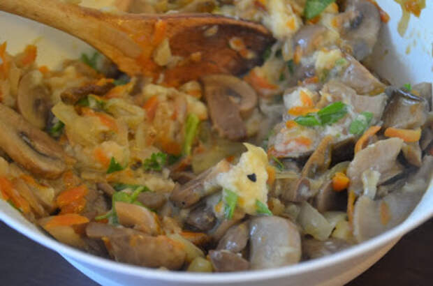 Добавляем грибную смесь и размешиваем, как следует солим, перчим, можно добавить тимьян или другие приправы по вкусу.