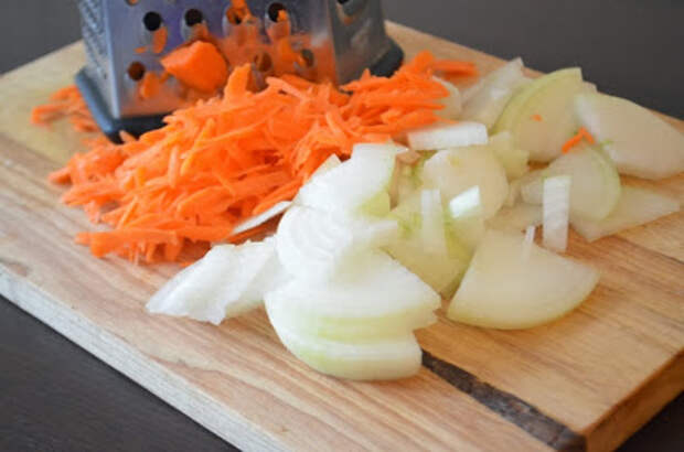 Морковь натереть на крупной терке, лук крупно нарубить.