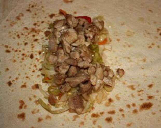 Капусту шинкуем и мнем руками, огурцы и помидоры режем кружочками (или как кому нравится). На лаваш выкладываем капусту, сверху - жареную курятину (я кладу 3 столовые ложки на порцию).