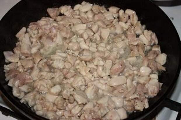 Срезаем мякоть с бедер, мелко режем и обжариваем на растительном масле до золотистого цвета.